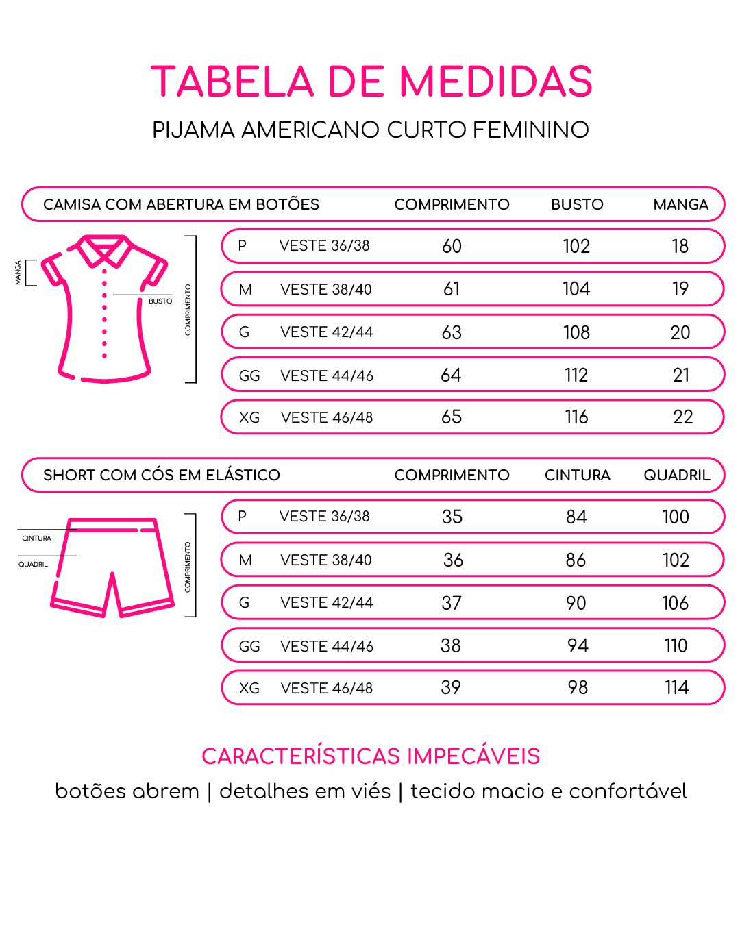 👕 Modelagem Americano Clássica: Blusa de botões frontais e short soltinho, que unem praticidade e elegância.